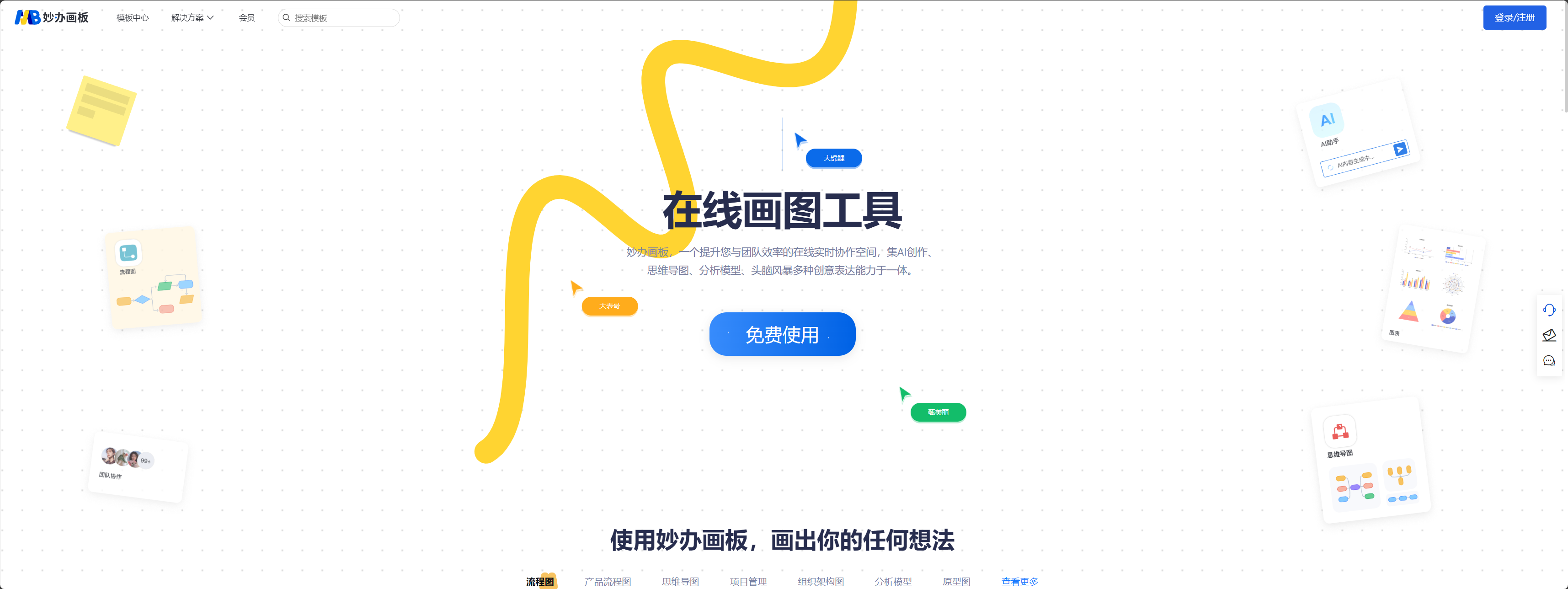 妙办画板,专门为您研发的画图软件工具,实现专业绘图软件工才能绘制的示意图、思维导图、流程图、组织架构图、脑图、关系图、结构图等;大量作图模板让你快速上手做图;妙办画板...