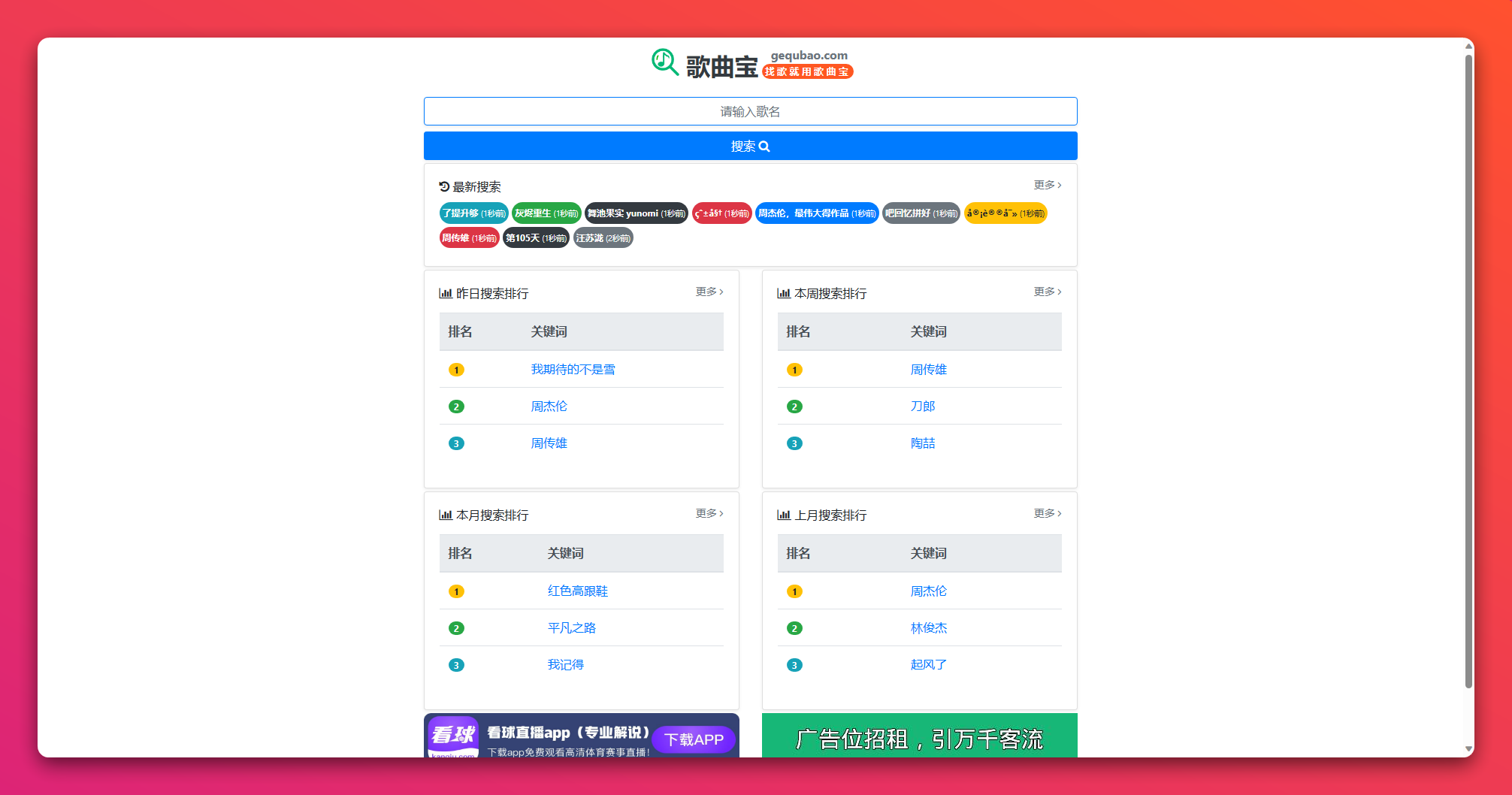 歌曲宝在线音乐搜索,可以在线免费下载全网MP3付费歌曲、流行音乐、经典老歌等。曲库完整,更新迅速,试听流畅,支持高品质|无损音质~