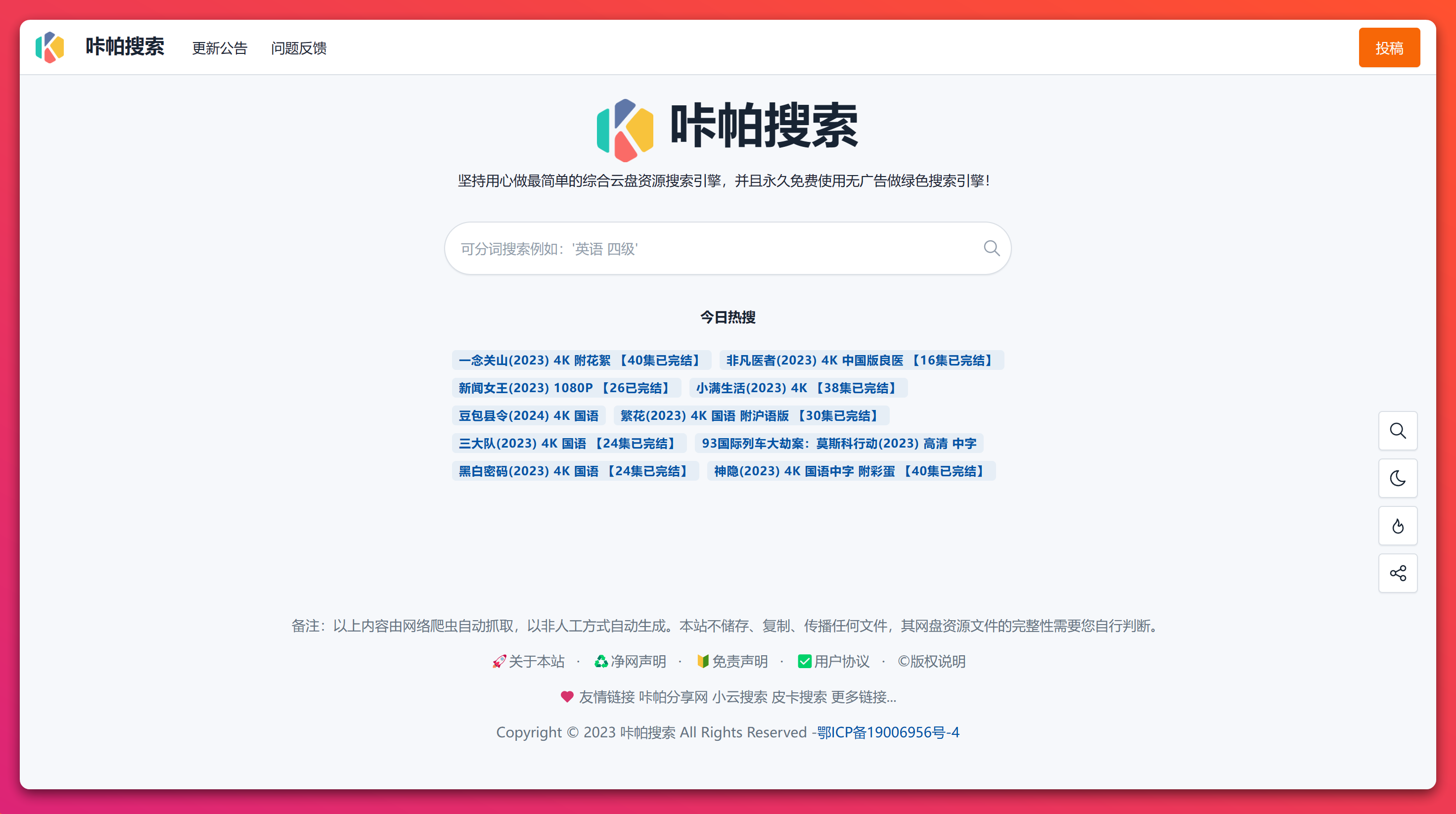 咔帕搜索(www.CuppaSo.com)是一个资源超丰富的综合资源搜索网站,咔帕搜索专注于收录全网综合盘资源,包括:影视资源、音乐资源、图片资源、电子书资源、软件资源、小说资源等等...