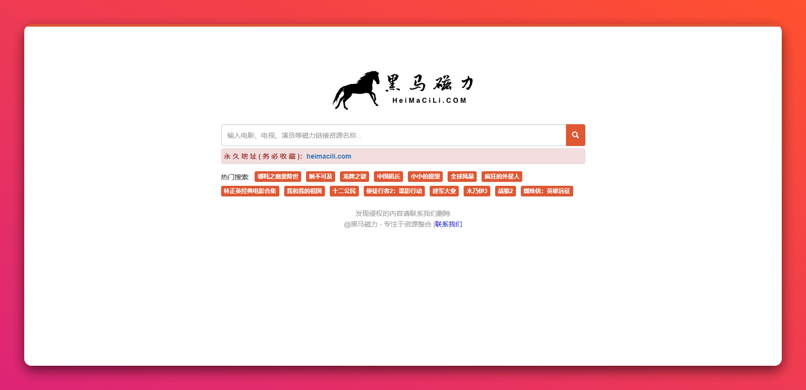 黑马磁力 - 专注于从DHT网络爬取种子和磁力链接,目前索引了上千万的磁力链接,资源涵盖了电影、剧集、音乐、图书、图片、综艺、软件、动漫、教程、游戏等领域,是全银河系资源最丰富...