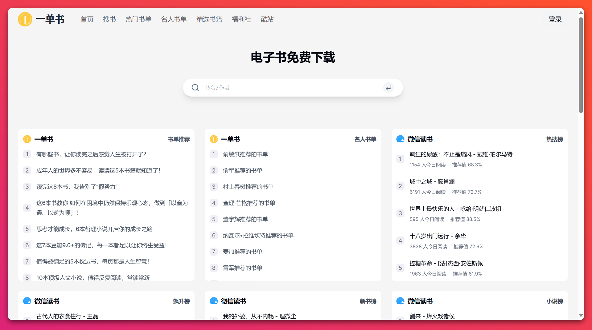 一单书是一个分享最新、最热门的小说、文学、社科、人文、历史等各类优质热门书单和名人书单,并提供免费下载电子书功能的网站。用一单书,阅读,看世界。下载需要微信关注公众号。
