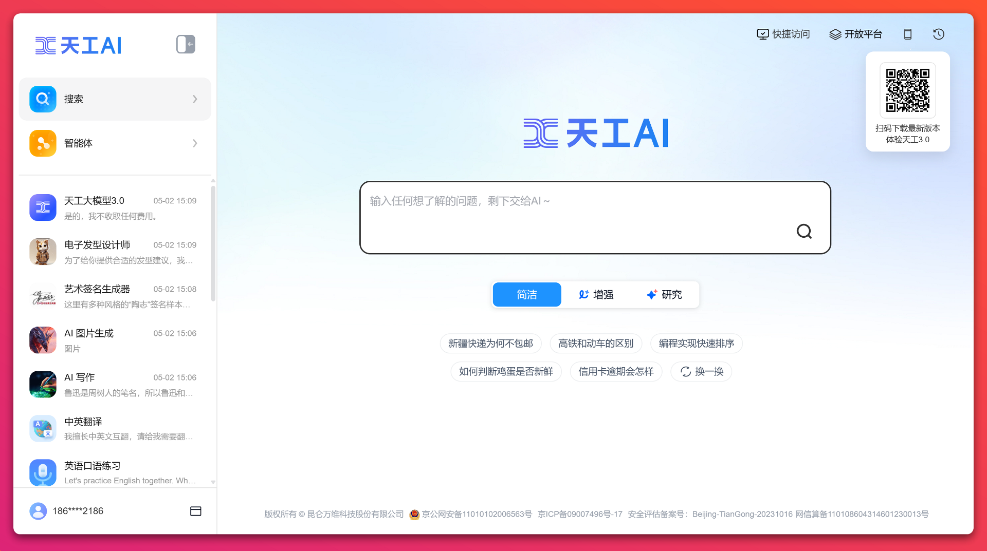 「天工」是国内首个对标 ChatGPT 的双千亿级大语言模型,也是一个对话式AI助手。「天工」通过自然语言与用户进行问答交互,AI 生成能力可满足文案创作、知识问答、逻辑推演、数理...