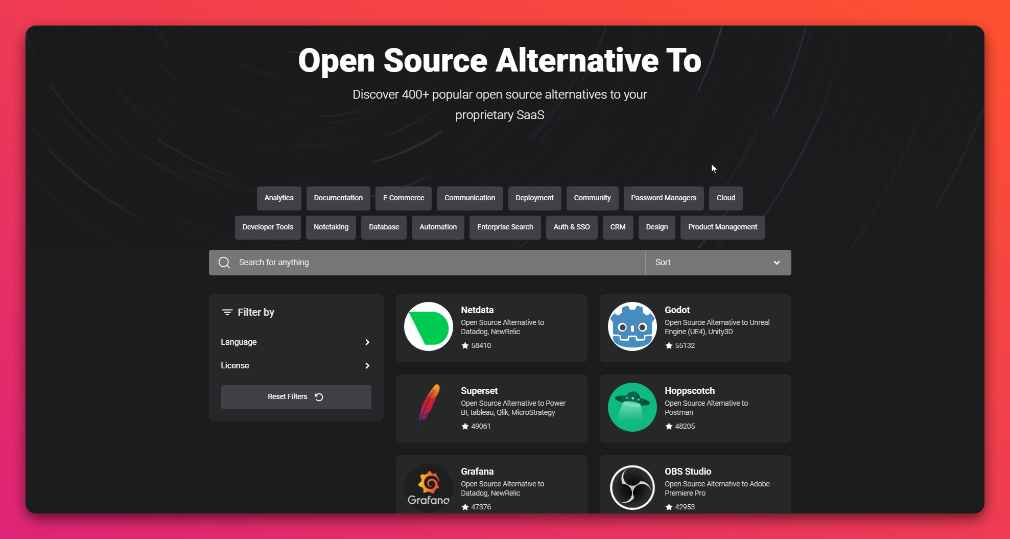 400+ 流行软件及服务的开源替代方案,可以进行关键字搜索,也可以根据开发语言和许可证进行筛选。